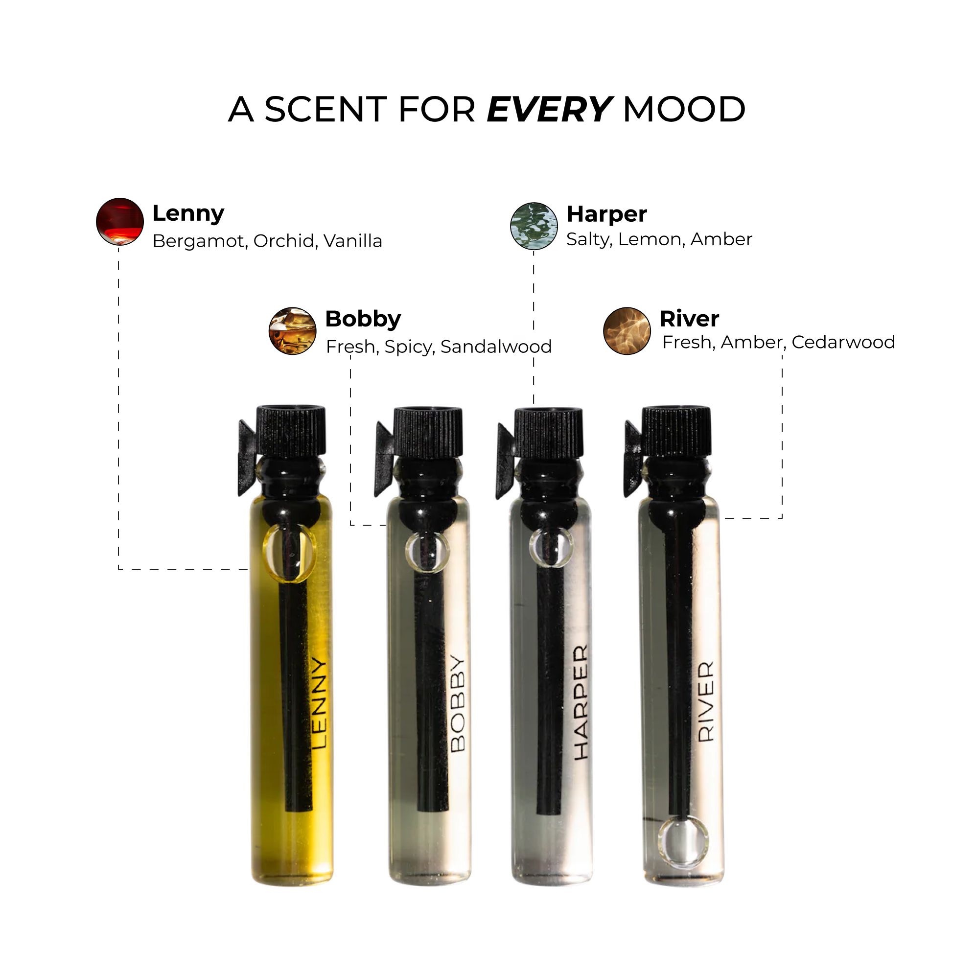Can't decide who’s your best fit? Now you can meet the whole gang to discover your partner in crime. Take Lenny, River, Bobby and Harper for a spin to find who compliments you the most. 2MLs of every scent.